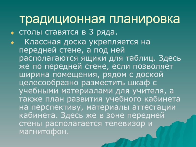 передней стене, а под ней располагаются ящики для таблиц. Здесь же по передней стене, если позволяет ширина помещения, рядом с доской целесообразно разместить шкаф с учебными материалами для учителя, а также план развития учебного кабинета на перспективу, материалы аттестации кабинета. Здесь же в зоне передней стены располагается телевизор и магнитофон.