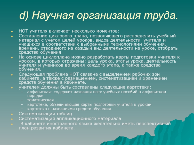 Следующая проблема НОТ связана с выделением рабочих зон кабинета, а также с размещением, систематизацией и хранением средств обучения в кабинете.