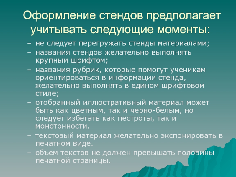 Слайд 23 Оформление стендов предполагает учитывать следующие моменты:
