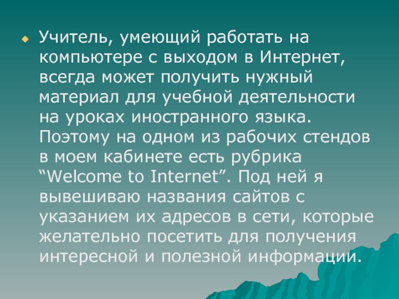 получить нужный материал для учебной деятельности на уроках иностранного языка. Поэтому на одном из рабочих стендов в моем кабинете есть рубрика “Welcome to Internet”. Под ней я вывешиваю названия сайтов с указанием их адресов в сети, которые желательно посетить для получения интересной и полезной информации.