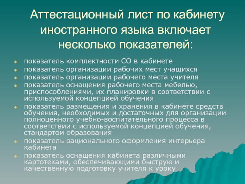 Слайд 26 Аттестационный лист по кабинету иностранного языка включает несколько показателей: