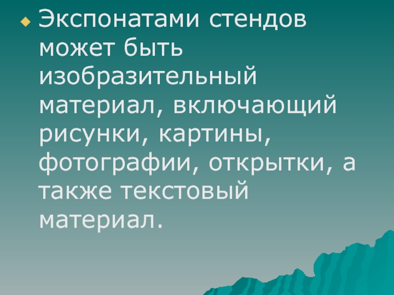 Слайд 18Экспонатами стендов может быть изобразительный материал, включающий рисунки, картины, фотографии, открытки,