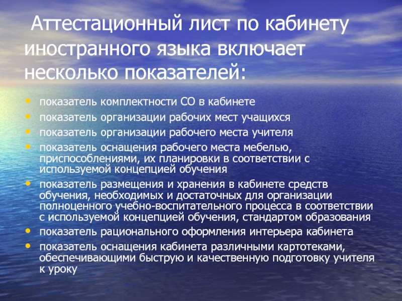 Слайд 24 Аттестационный лист по кабинету иностранного языка включает несколько показателей: