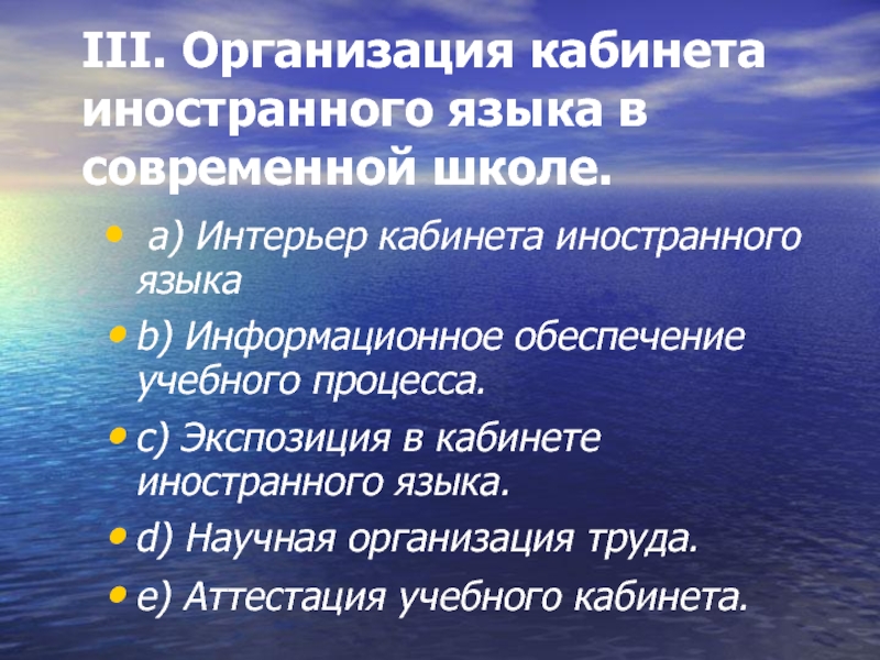 Слайд 7III. Организация кабинета иностранного языка в современной школе.