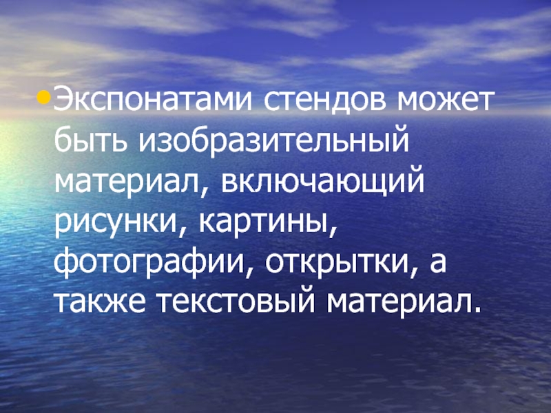 Слайд 18Экспонатами стендов может быть изобразительный материал, включающий рисунки, картины, фотографии, открытки,