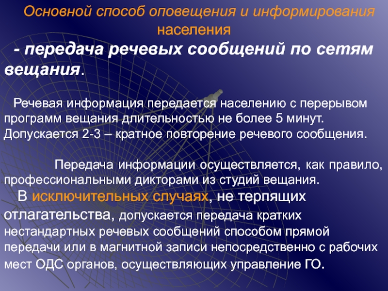 Речевая информация передается населению с перерывом программ вещания длительностью не более 5 минут. Допускается 2-3 – кратное повторение речевого сообщения.