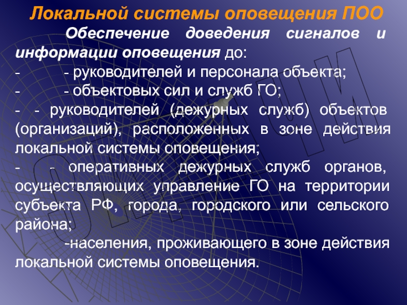 - - руководителей (дежурных служб) объектов (организаций), расположенных в зоне действия локальной системы оповещения;