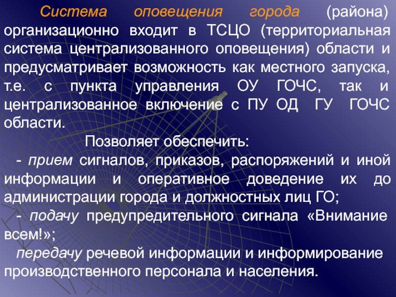Слайд 38 Система оповещения города (района) организационно входит в ТСЦО (территориальная система