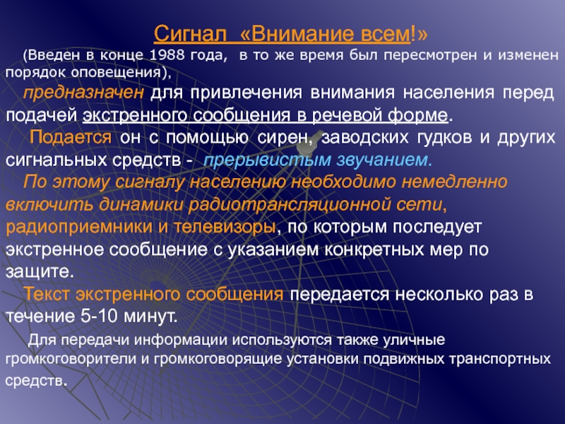 По этому сигналу населению необходимо немедленно включить динамики радиотрансляционной сети, радиоприемники и телевизоры, по которым последует экстренное сообщение с указанием конкретных мер по защите.