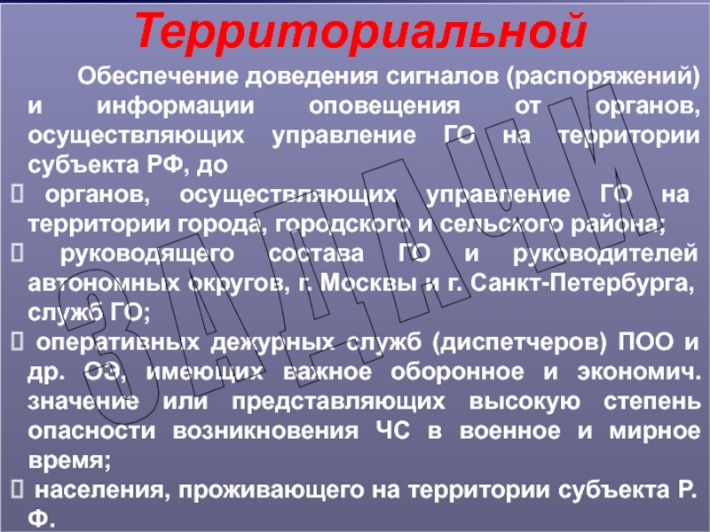 Территориальные - создаются, совершенствуются и поддерживаются в постоянной готовности под руководством соответствующего руководителя ГО органами, осуществляющими управление ГО на территории субъекта РФ, с участием служб оповещения и связи ГО, дочерних ВГТРК федеральных государственных унитарных предприятий и филиалов;