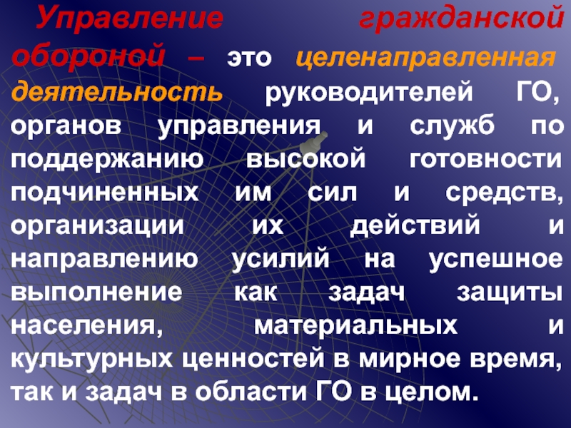 и служб по поддержанию высокой готовности подчиненных им сил и средств, организации их действий и направлению усилий на успешное выполнение как задач защиты населения, материальных и культурных ценностей в мирное время, так и задач в области ГО в целом.