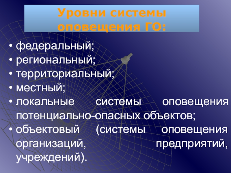 - аппаратура оповещения и каналы связи для передачи сигналов оповещения ГО подчиненным силам ГО и взаимодействующим органам управления;