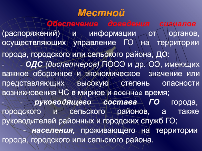 Местные - создаются, совершенствуются и поддерживаются в постоянной готовности к задействованию под руководством соответствующего руководителя ГО органами, осуществляющими управление ГО на территории города, городского или сельского района с участием служб оповещения и связи ГО;