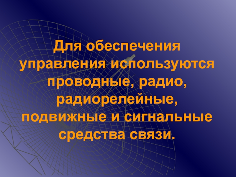 Слайд 14Для обеспечения управления используются проводные, радио, радиорелейные, подвижные и сигнальные средства