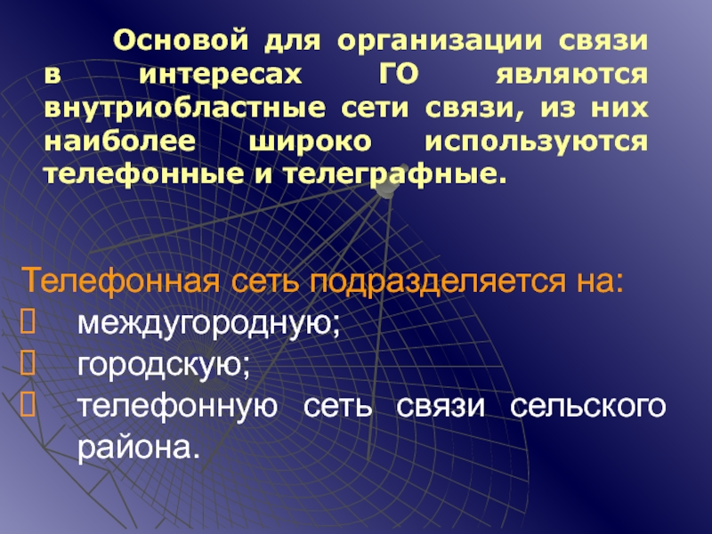 организации связи в интересах ГО являются внутриобластные сети связи, из них наиболее широко используются телефонные и телеграфные.