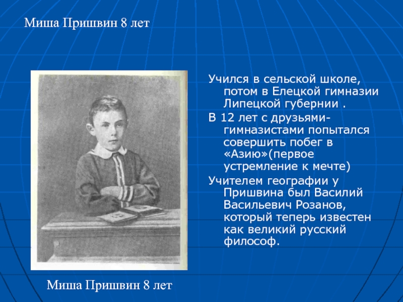 Учителем географии у Пришвина был Василий Васильевич Розанов, который теперь известен как великий русский философ.