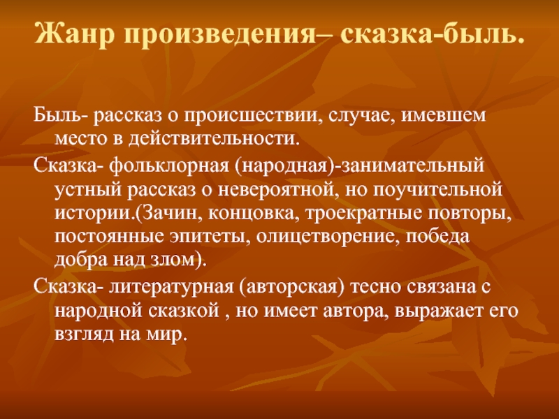 Сказка- фольклорная (народная)-занимательный устный рассказ о невероятной, но поучительной истории.(Зачин, концовка, троекратные повторы, постоянные эпитеты, олицетворение, победа добра над злом).