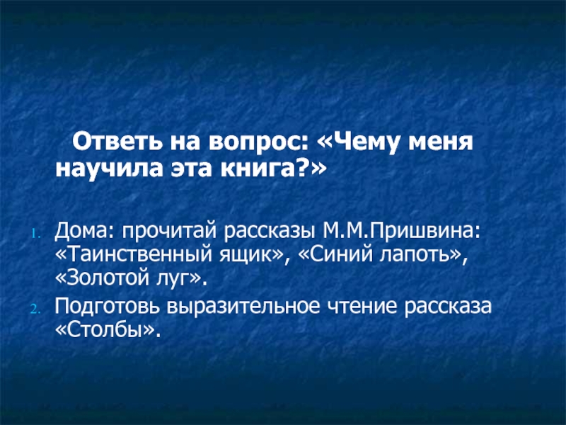 Дома: прочитай рассказы М.М.Пришвина: «Таинственный ящик», «Синий лапоть», «Золотой луг».