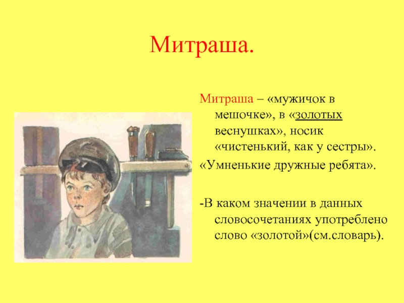 Митраша – «мужичок в мешочке», в «золотых веснушках», носик «чистенький, как
