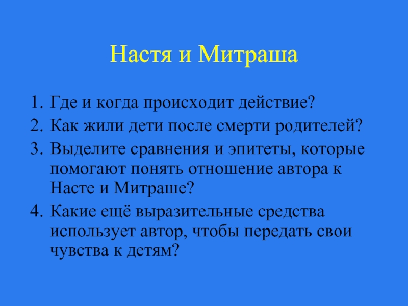 Выделите сравнения и эпитеты, которые помогают понять отношение автора к Насте и Митраше?