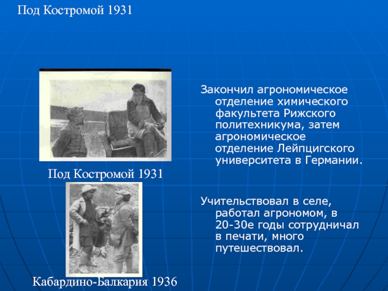 Учительствовал в селе, работал агрономом, в 20-30е годы сотрудничал в печати, много путешествовал.