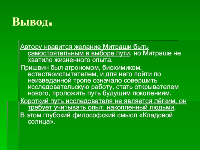 Пришвин был агрономом, биохимиком, естествоиспытателем, и для него пойти по неизведанной тропе означало совершить исследовательскую работу, стать открывателем нового, проложить путь будущим поколениям.