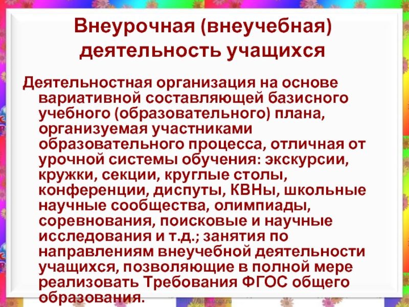 (образовательного) плана, организуемая участниками образовательного процесса, отличная от урочной системы обучения: экскурсии, кружки, секции, круглые столы, конференции, диспуты, КВНы, школьные научные сообщества, олимпиады, соревнования, поисковые и научные исследования и т.д.; занятия по направлениям внеучебной деятельности учащихся, позволяющие в полной мере реализовать Требования ФГОС общего образования.