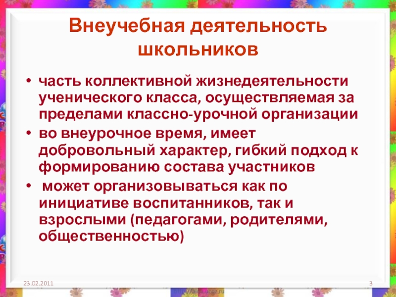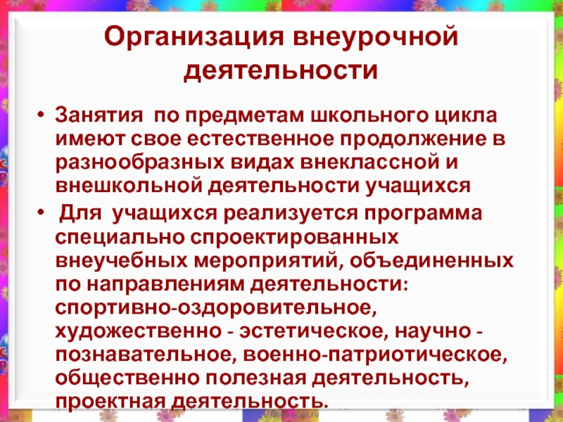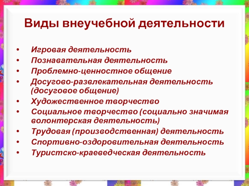 Внеучебная деятельность понятие, объединяющее все виды деятельности школьников (кроме учебной), в которых возможно и целесообразно решение задач их воспитания и социализации