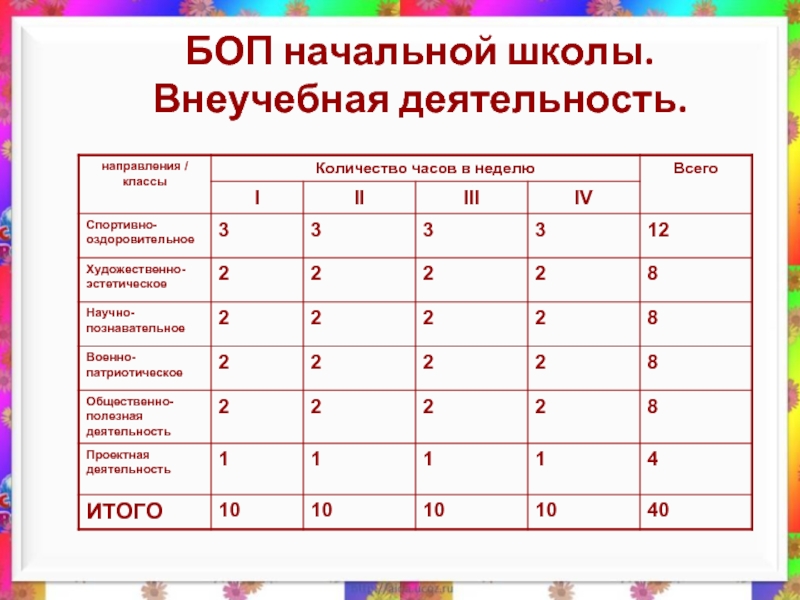 деятельность по 10 ч в неделю во всех классах начальной школы.