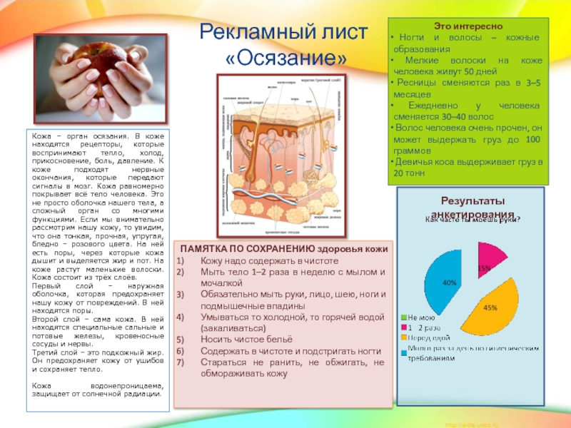 Кожа – орган осязания. В коже находятся рецепторы, которые воспринимают тепло, холод, прикосновение, боль, давление. К коже подходят нервные окончания, которые передают сигналы в мозг. Кожа равномерно покрывает всё тело человека. Это не просто оболочка нашего тела, а сложный орган со многими функциями. Если мы внимательно рассмотрим нашу кожу, то увидим, что она тонкая, прочная, упругая, бледно – розового цвета. На ней есть поры, через которые кожа дышит и выделяется жир и пот. На коже растут маленькие волоски. Кожа состоит из трёх слоёв.