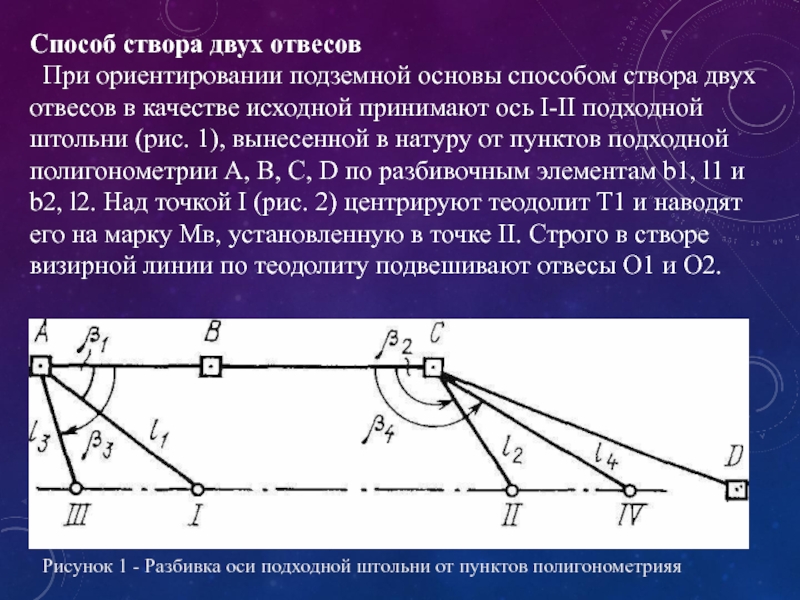 При ориентировании подземной основы способом створа двух отвесов в качестве исходной принимают ось I-II подходной штольни (рис. 1), вынесенной в натуру от пунктов подходной полигонометрии A, B, C, D по разбивочным элементам b1, l1 и b2, l2. Над точкой I (рис. 2) центрируют теодолит Т1 и наводят его на марку Мв, установленную в точке II. Строго в створе визирной линии по теодолиту подвешивают отвесы O1 и О2.