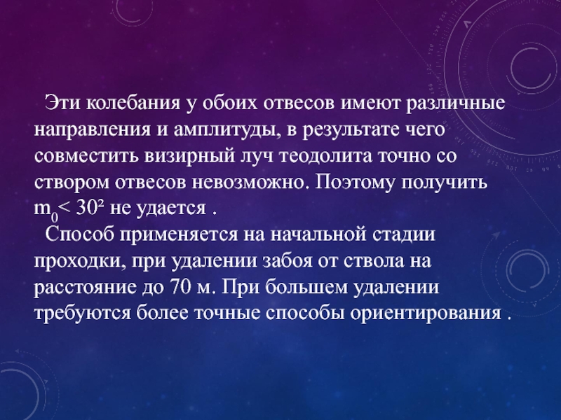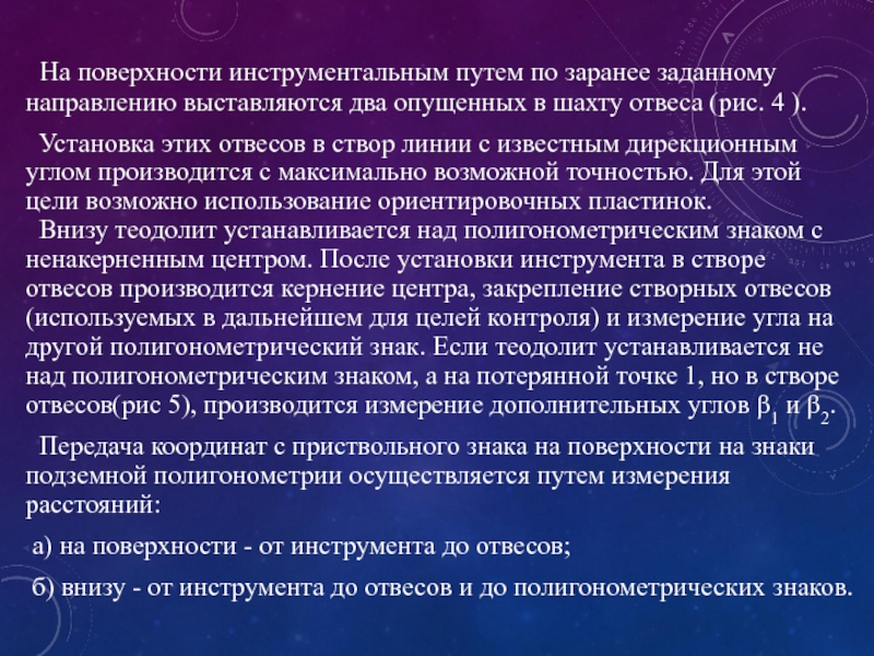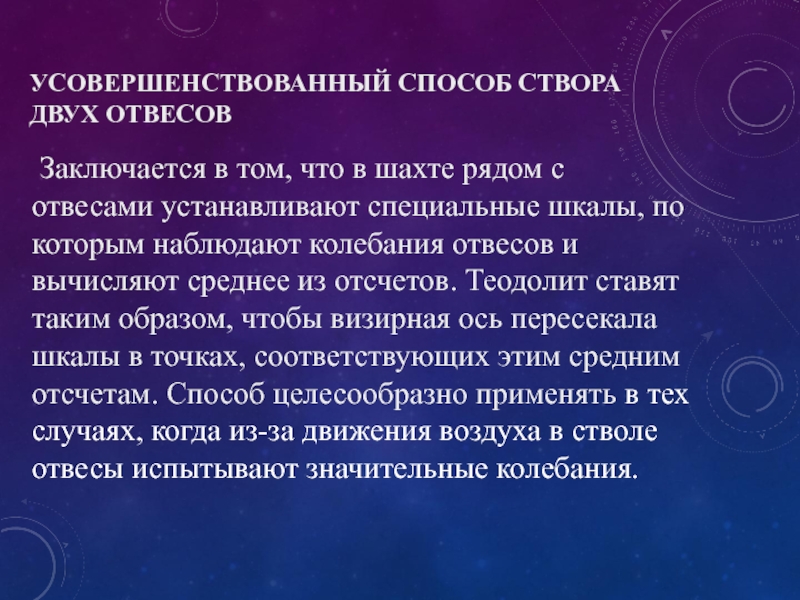 с отвесами устанавливают специальные шкалы, по которым наблюдают колебания отвесов и вычисляют среднее из отсчетов. Теодолит ставят таким образом, чтобы визирная ось пересекала шкалы в точках, соответствующих этим средним отсчетам. Способ целесообразно применять в тех случаях, когда из-за движения воздуха в стволе отвесы испытывают значительные колебания.