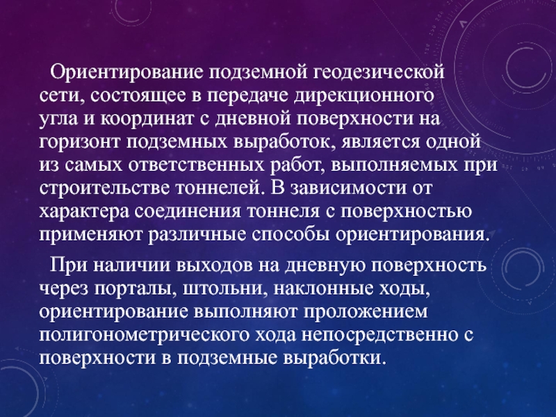 угла и координат с дневной поверхности на горизонт подземных выработок, является одной из самых ответственных работ, выполняемых при строительстве тоннелей. В зависимости от характера соединения тоннеля с поверхностью применяют различные способы ориентирования.