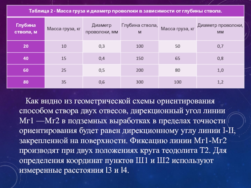 Слайд 1ОРИЕНТИРОВАНИЕ ПОДЗЕМНОЙ ВЫРАБОТКИ СПОСОБАМ ДВУХ ОТВЕСОВ.