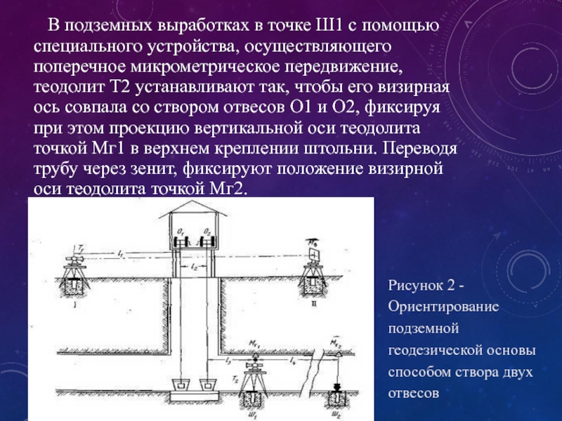 устройства, осуществляющего поперечное микрометрическое передвижение, теодолит Т2 устанавливают так, чтобы его визирная ось совпала со створом отвесов О1 и О2, фиксируя при этом проекцию вертикальной оси теодолита точкой Mг1 в верхнем креплении штольни. Переводя трубу через зенит, фиксируют положение визирной оси теодолита точкой Мг2.