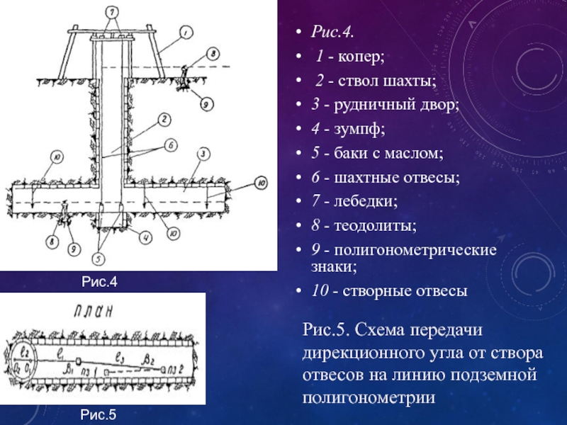 г) измерение направлений вверху - на азимутальный пункт, знаки подходной полигонометрии и на отвесы; внизу - на знаки подземной полигонометрии и на отвесы.