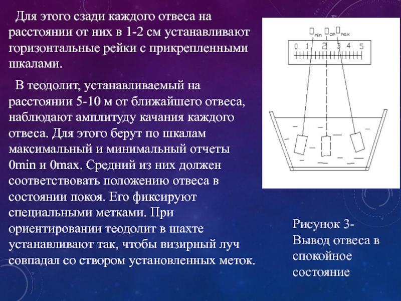 В теодолит, устанавливаемый на расстоянии 5-10 м от ближайшего отвеса, наблюдают амплитуду качания каждого отвеса. Для этого берут по шкалам максимальный и минимальный отчеты 0min и 0max. Средний из них должен соответствовать положению отвеса в состоянии покоя. Его фиксируют специальными метками. При ориентировании теодолит в шахте устанавливают так, чтобы визирный луч совпадал со створом установленных меток.