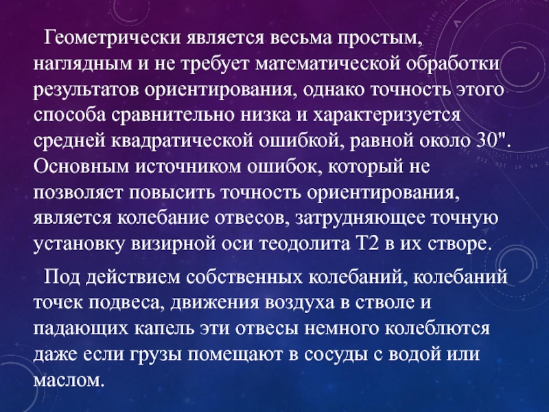 результатов ориентирования, однако точность этого способа сравнительно низка и характеризуется средней квадратической ошибкой, равной около 30". Основным источником ошибок, который не позволяет повысить точность ориентирования, является колебание отвесов, затрудняющее точную установку визирной оси теодолита Т2 в их створе.