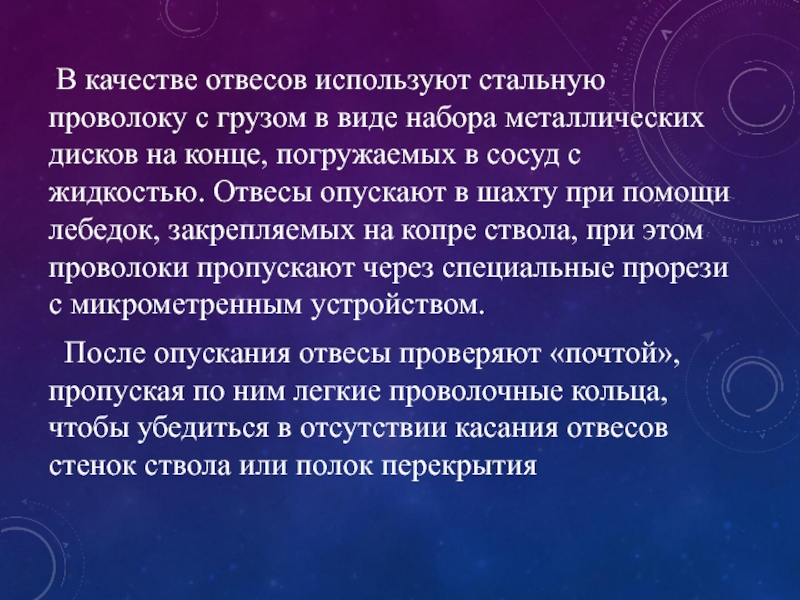 набора металлических дисков на конце, погружаемых в сосуд с жидкостью. Отвесы опускают в шахту при помощи лебедок, закрепляемых на копре ствола, при этом проволоки пропускают через специальные прорези с микрометренным устройством.