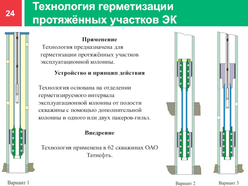 Технология основана на отделении герметизируемого интервала эксплуатационной колонны от полости скважины с помощъю дополнительной колонны и одного или двух пакеров-гильз.