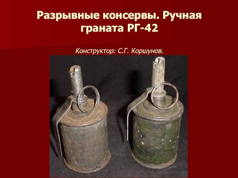 Слайд 7Разрывные консервы. Ручная граната РГ-42 Конструктор: С.Г. Коршунов.
