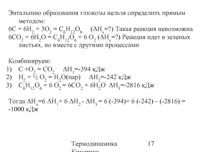 Энтальпию образования глюкозы нельзя определить прямым методом: