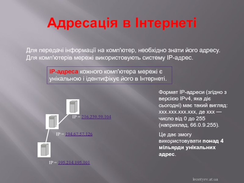 IP-адреса кожного комп'ютера мережі є унікальною і ідентифікує його в Інтернеті.