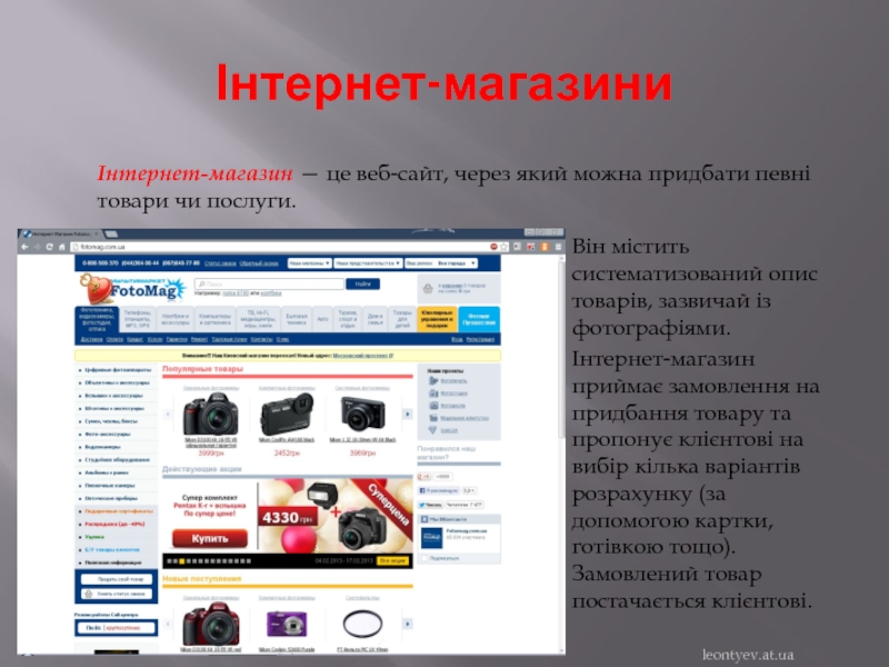 Інтернет-магазин приймає замовлення на придбання товару та пропонує клієнтові на вибір кілька варіантів розрахунку (за допомогою картки, готівкою тощо). Замовлений товар постачається клієнтові.