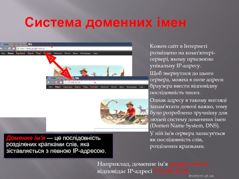 Наприклад, доменне ім'я google.com.ua відповідає IP-адресі 173.194.32.24