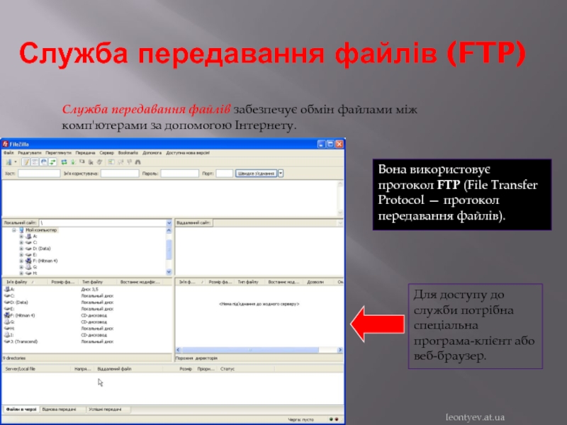 Вона використовує протокол FTP (File Transfer Protocol — протокол передавання файлів).