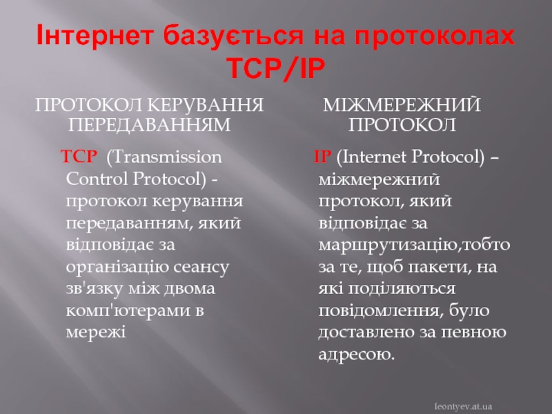 ІР (Internet Protocol) – міжмережний протокол, який відповідає за маршрутизацію,тобто за те, щоб пакети, на які поділяються повідомлення, було доставлено за певною адресою.
