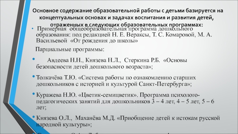 Слайд 11 Основное содержание образовательной работы с детьми базируется на концептуальных основах