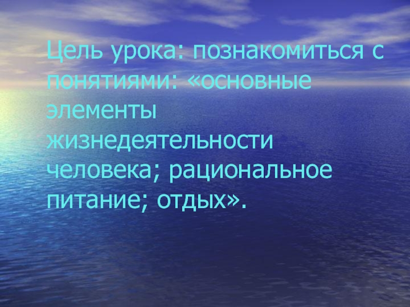 Слайд 2Цель урока: познакомиться с понятиями: «основные элементы жизнедеятельности человека; рациональное питание;