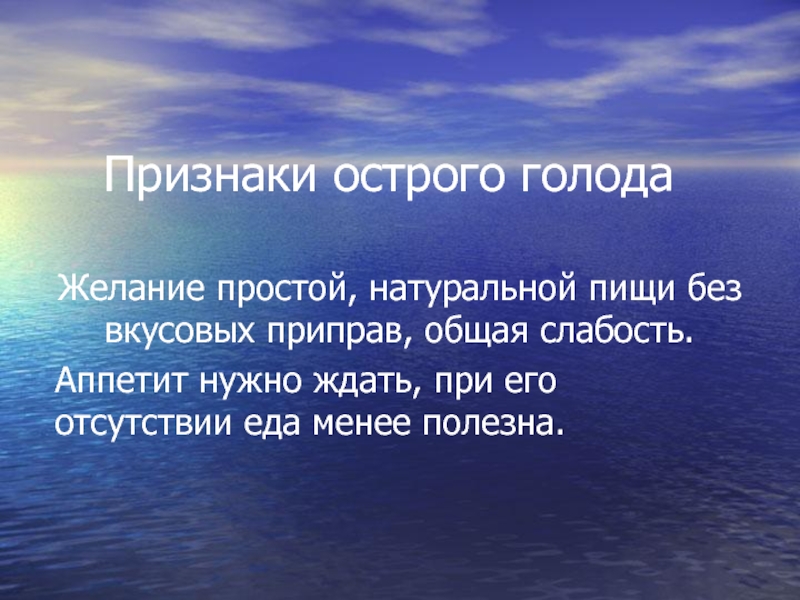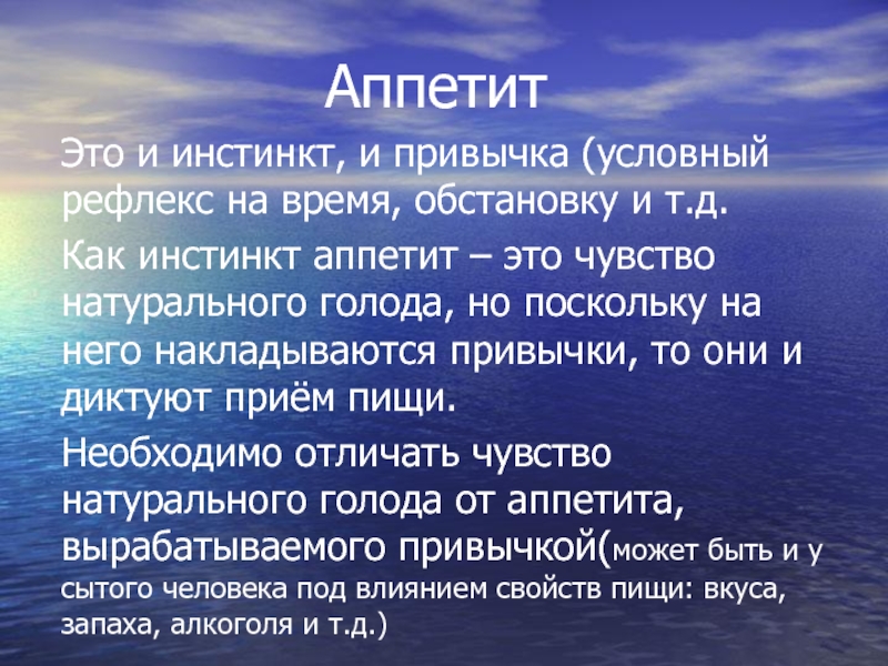 Необходимо отличать чувство натурального голода от аппетита, вырабатываемого привычкой(может быть и у сытого человека под влиянием свойств пищи: вкуса, запаха, алкоголя и т.д.)